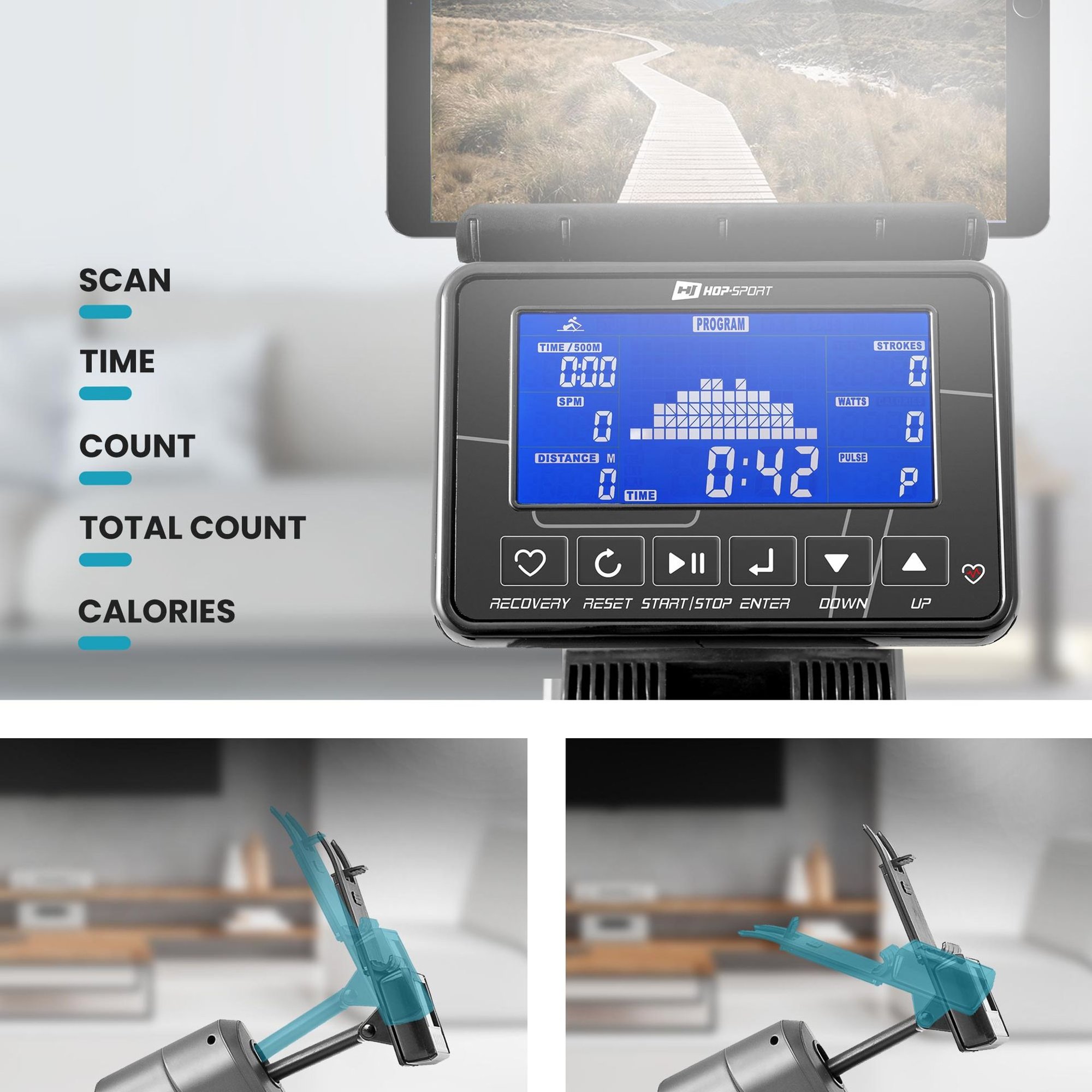 (inclusa la modalità gara) e la funzione Recovery, grazie alla quale puoi verificare la tua capacità fisica. Il supporto integrato per tablet ti consente di utilizzare comodamente il tuo dispositivo mobile durante l'esercizio. Grazie alla regolazione dell'angolo di inclinazione del computer, puoi adattarne l'impostazione alle tue esigenze. Inoltre, il computer consente la misurazione del polso – tramite la fascia toracica wireless compatibile con il vogatore