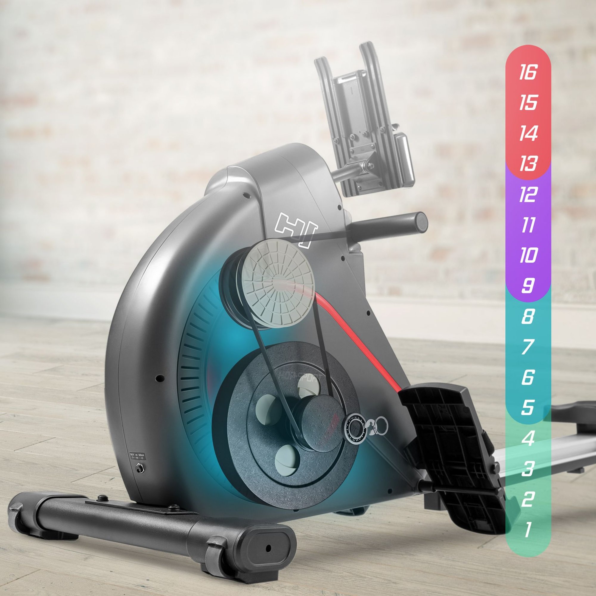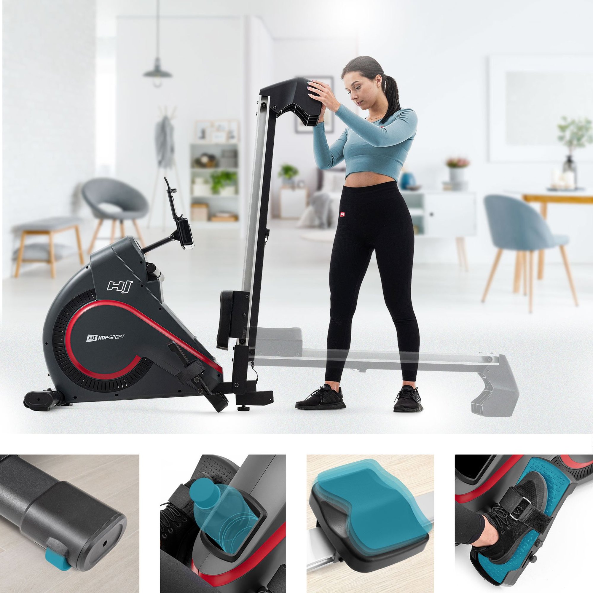 Vogatore magnetico HS-095R Spike con computer con programmi di allenamento e accesso alle app mobili. Sistema di resistenza magnetica, compatibile con fascia telemetrica. Il vogatore pieghevole e silenzioso per uso domestico.